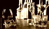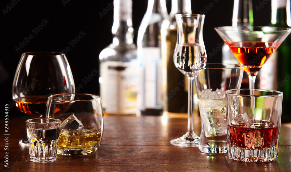 Array of alcoholic beverages in glasses at a bar