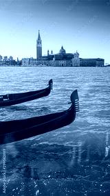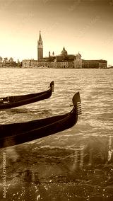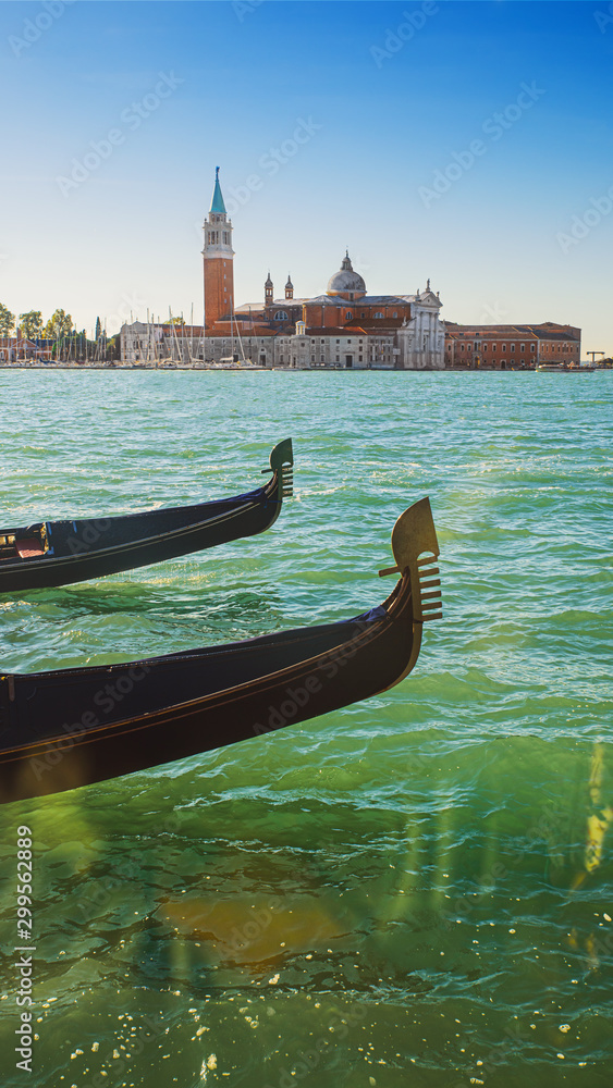 Gondolas moored at sunset, St. Mark's basin, Venice, Italy