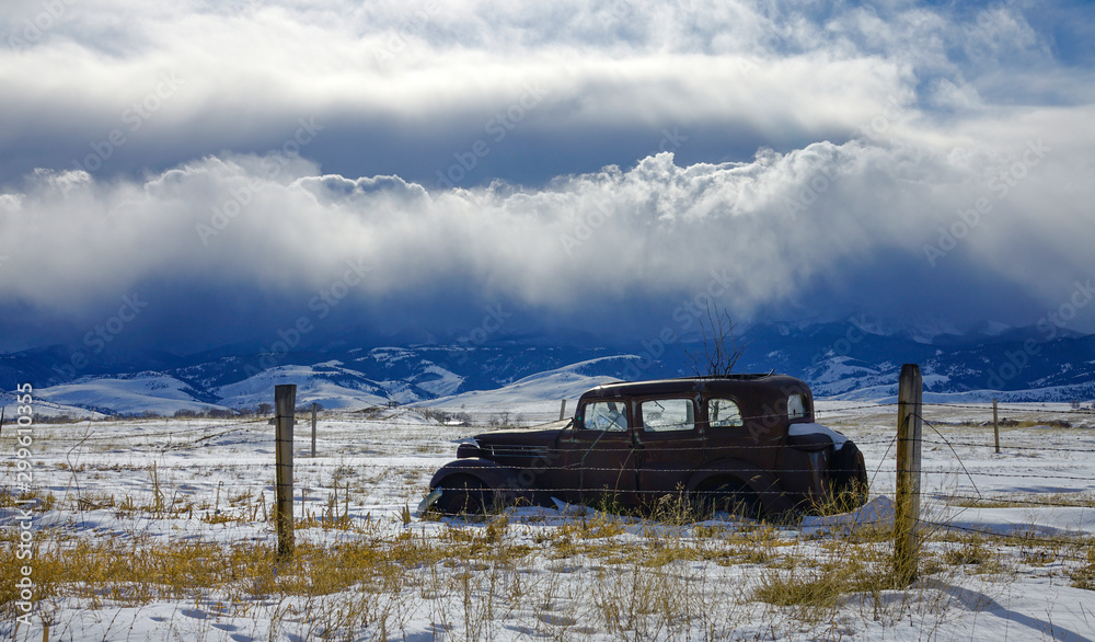 Abandoned vintage car is left to corrode in the scenic Montana countryside.