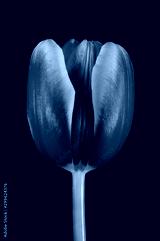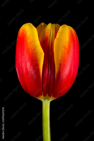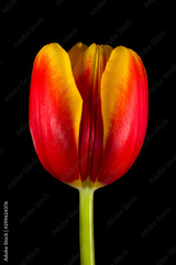 Tulip, flower bud with red and yellow petals and green stem isolated on black background