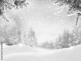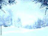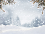 Snowfall in winter forest.Beautiful landscape with snow covered fir trees and snowdrifts.Merry Christmas and happy New Year greeting background with copy-space.Winter fairytale.