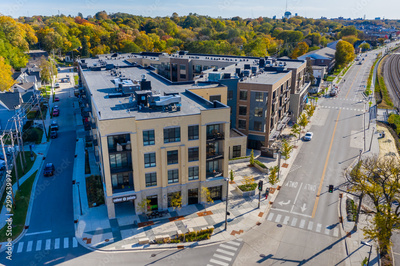 Aerial view of downtown Wauwatosa Wisconsin along Harwood Avenue