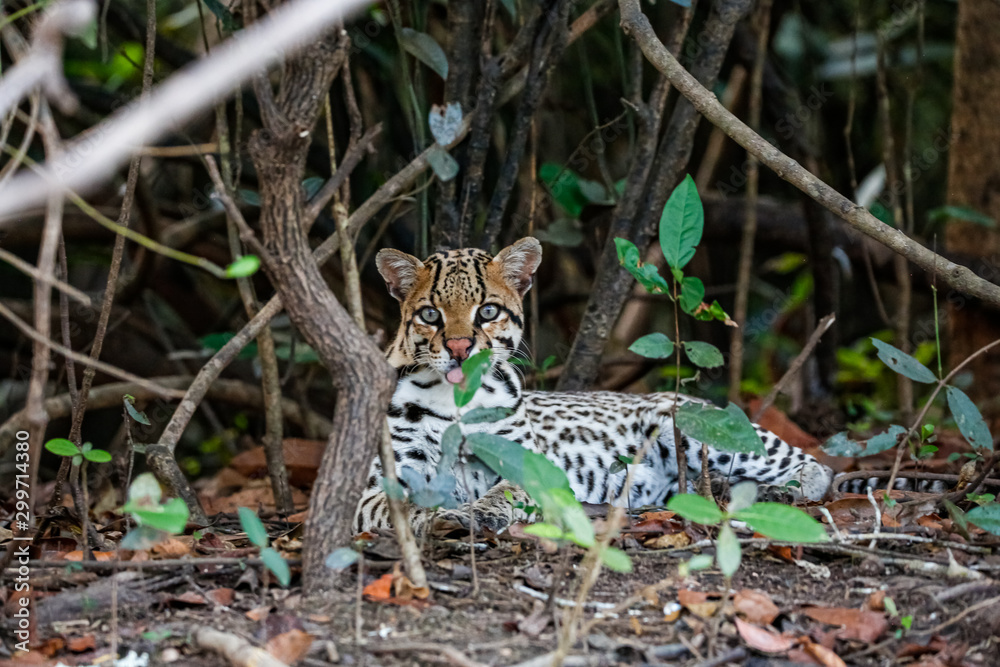 Close up of a young Ocelot resting in the undergrowth at a river edge, facing camera, Pantanal Wetlands, Mato Grosso, Brazil