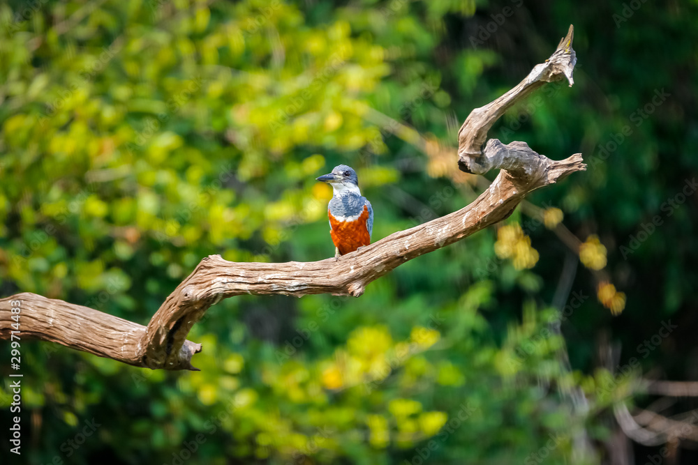 Close up of a Ringed Kingfisher perched on a bare branch against defocused green background, Pantanal Wetlands, Mato Grosso, Brazil