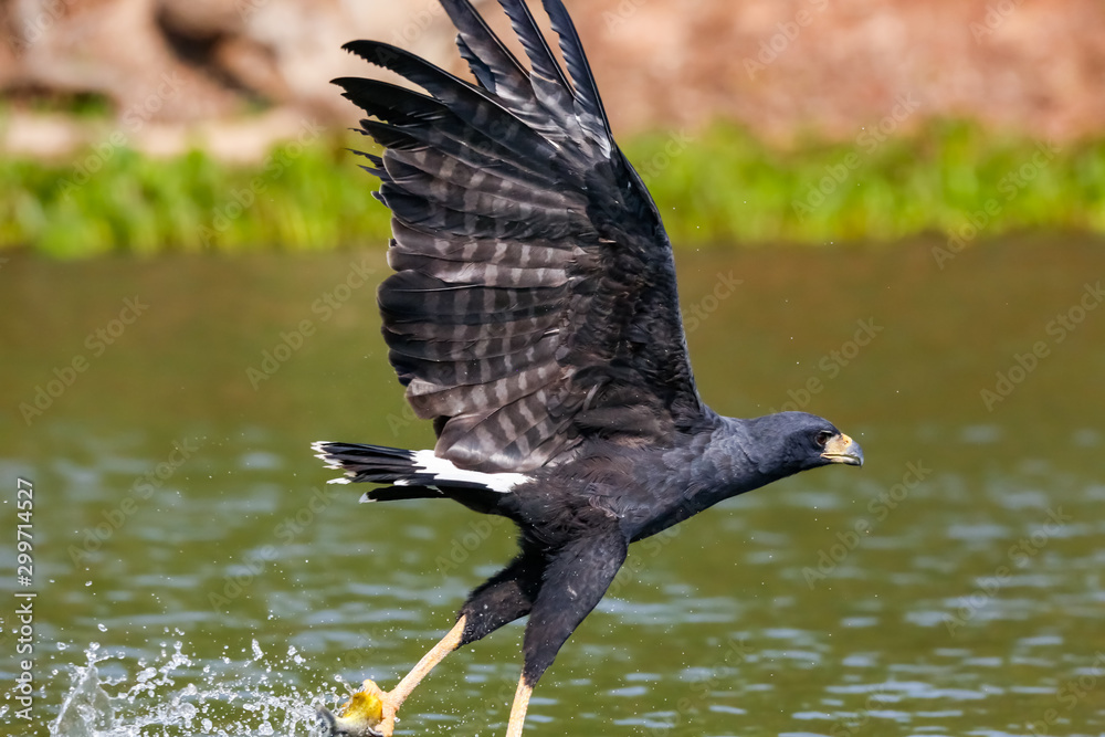 Great Black Hawk with a piranha in its claw in flight over a river, wings spread up, Pantanal Wetlands, Mato Grosso, Brazil