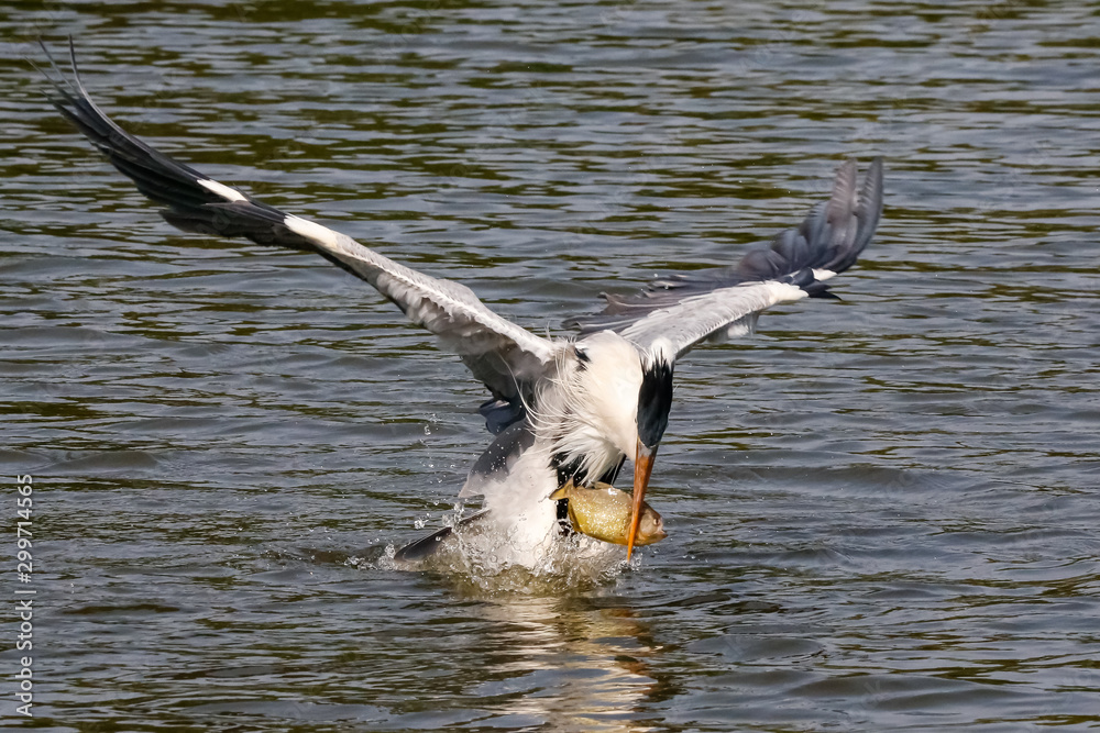 Cocoi Heron catches a piranha with its beak just over the water surface, wings spread, Pantanal Wetlands, Mato Grosso, Brazil