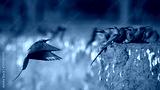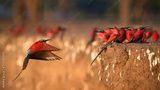 Red birds. Colorful Southern Carmine bee-eater, Merops nubicoides, colony of red and blue winged african birds on the bank of Zambezi river. Bird photography in ManaPools, Zimbabwe.
