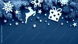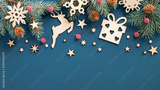 Vintage Christmas frame border. Flat lay fir tree branches, red berries, wooden stars and snowflakes over blue background. Top view, copy space.