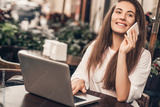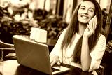 Beautiful woman work on laptop and using phone sitting in street cafe.