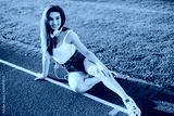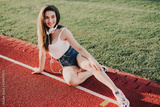 Stylish woman posing for the camera sitting on running track.