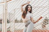 Beautiful fitness woman in sportswear posing near grid.