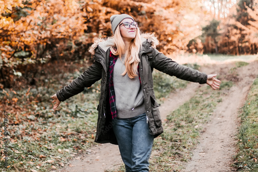 Hiking and travel along in the forest. Concept of trekking, adventure and seasonal vacation. Young woman walking in woods.