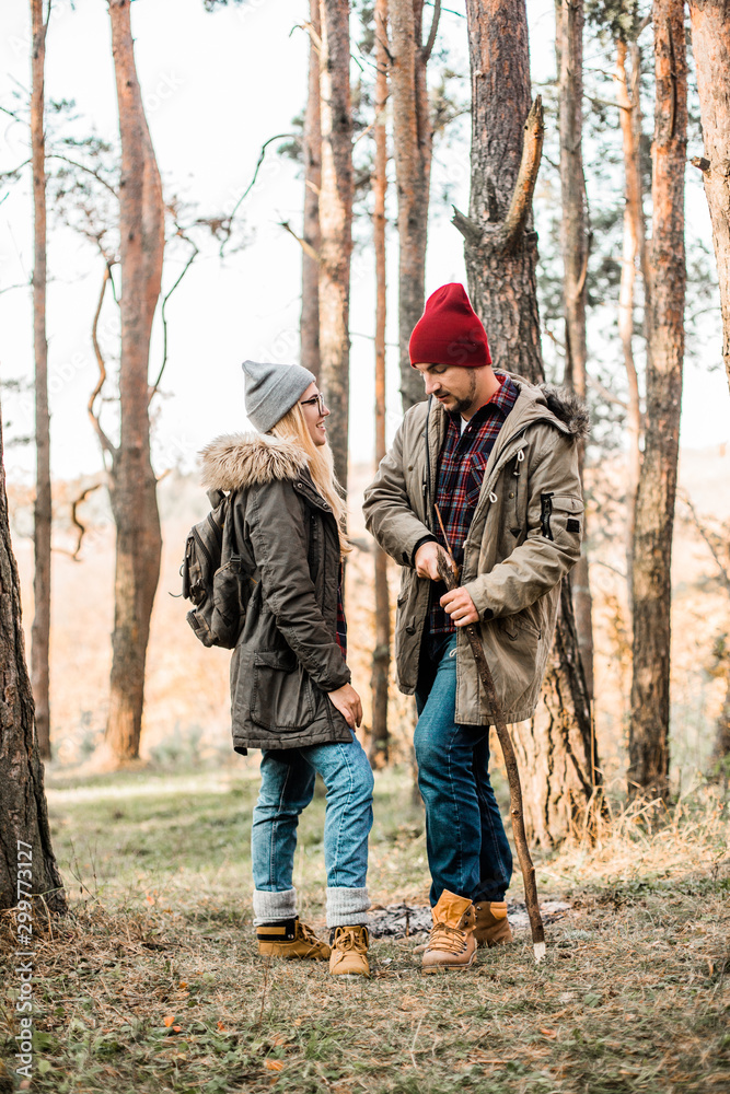 Hiking couple with backpack walking in the forest and exploring outdoors. Freedom and active travel concept.