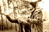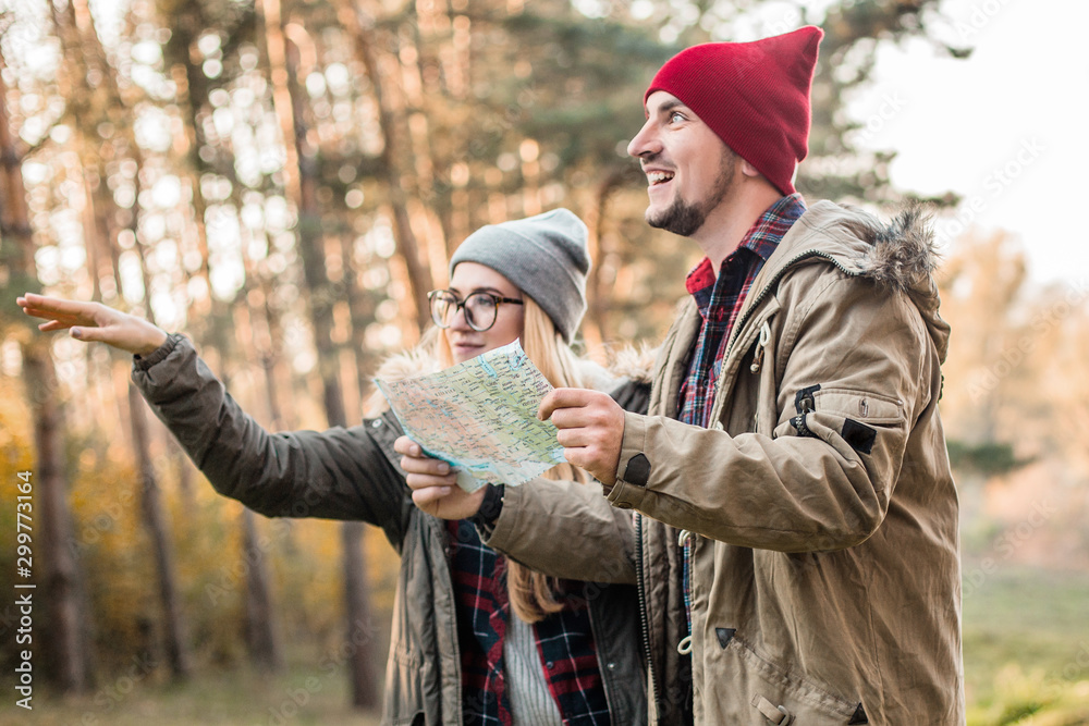 Traveler couple with map, compass and backpack exploring forest. Freedom and active travel concept.