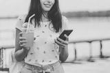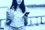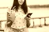 Beautiful young woman walking with phone and orange drink on pier at sunset in summer.