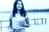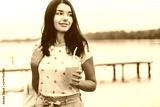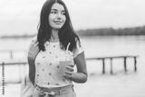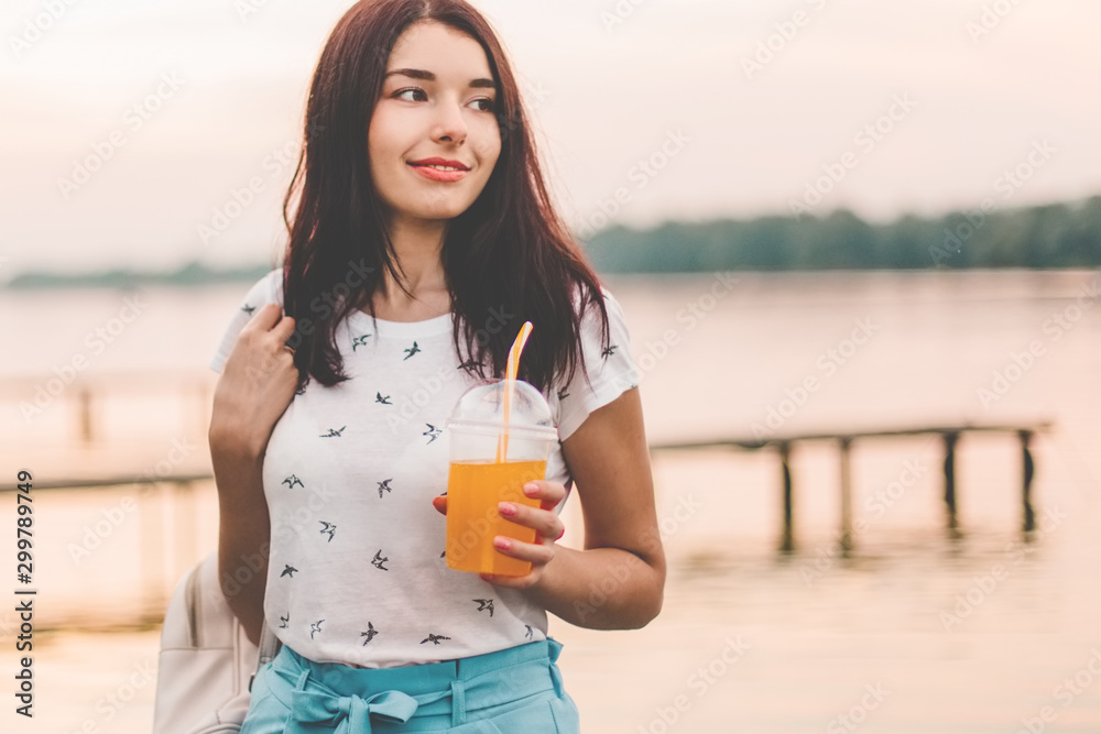 Beautiful young woman walking with orange drink on pier at sunset in summer.