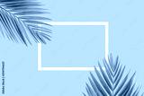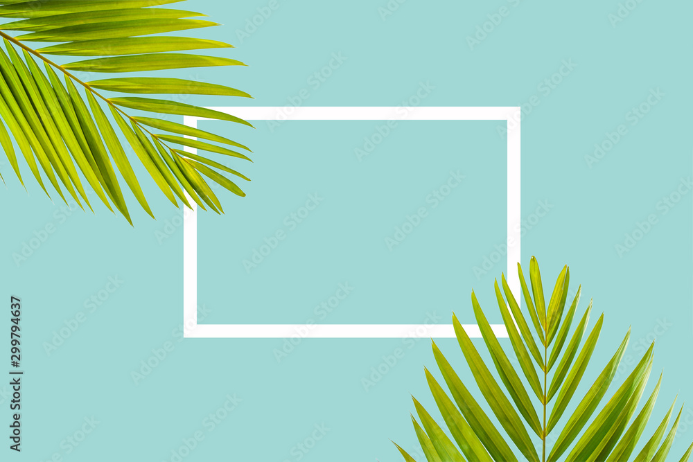 Natural palm leaf with white frame on pastel blue background, nature background