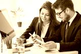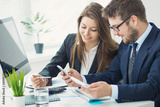 Young businessman discussing something with his colleague, and using a digital tablet together