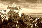Medieval Meersburg Castle at Lake Constance or Bodensee, Germany. It is a landmark of Meersburg town. Landscape with old German castle in summer. Scenery of tourist attraction in sunset light.