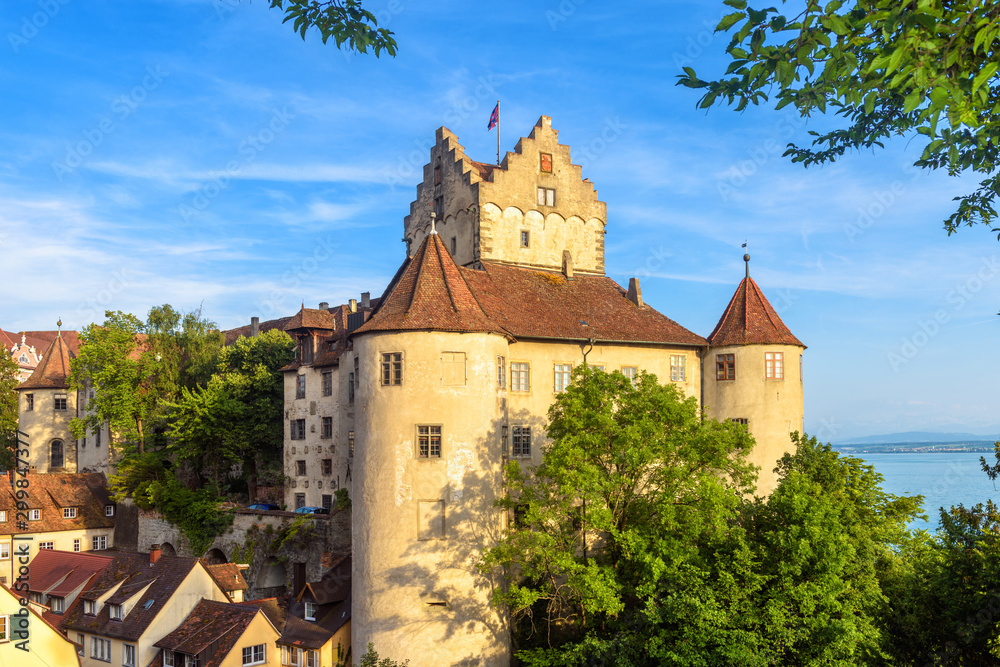 Meersburg Castle at Lake Constance or Bodensee, Germany. This old castle is landmark of Meersburg town. Scenic view of medieval German castle in summer. Scenery of Swabian tourist attraction.
