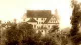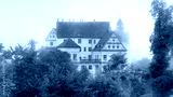 Castle of Heiligenberg in mist, Linzgau, Germany. This Renaissance castle is a landmark of Baden-Wurttemberg. Scenic view of mystery castle in foggy garden. Scenery of old German castle in summer.