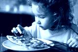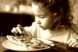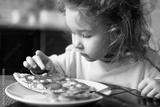 Child looks at pizza on table. Three years old kid is going to eat by himself. Little girl wants to take a piece of food from plate. Feeding cute baby at home. Portrait of nice child in kitchen.