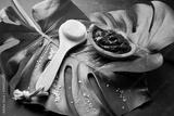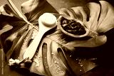 Spa. Dead sea mud in a bowl of olive wood, brush for body massage, sea salt on big green leaf. On dark background top view. Copy space