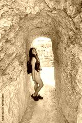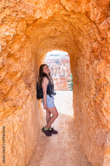 Young woman standing in desert landscape tunnel view in Bryce Canyon National Park on Navajo loop with sandstone rock on famous trail