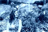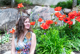 Vail town or village city in Colorado summer with happy woman young girl sitting by large big red poppy flowers in garden by rocks