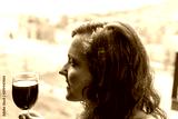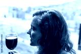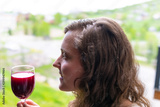 Closeup of happy woman tasting red wine by view of Crested Butte snow mountains from apartment balcony window