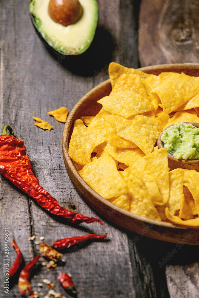 Tortilla nachos corn chips with avocado guacamole sauce served in wood plate with half of avocado and chilli peppers over old wooden background.