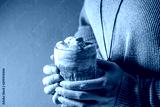 Woman in grey sweater hold in hands ceramic mug with hot chocolate or cocoa with marshmallow.