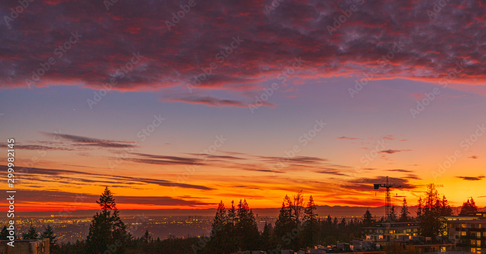 Sunset at UniverCity on Burnaby Mountainlooking Soputh West across greater Vancouver to Gulf Islnads in silhouette