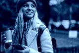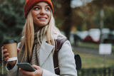 Young girl with coffee to go holding smartphone