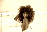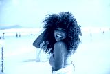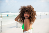 Black afro young cute girl, curly hair, bikini, beach. Afro American summer vacation holiday.