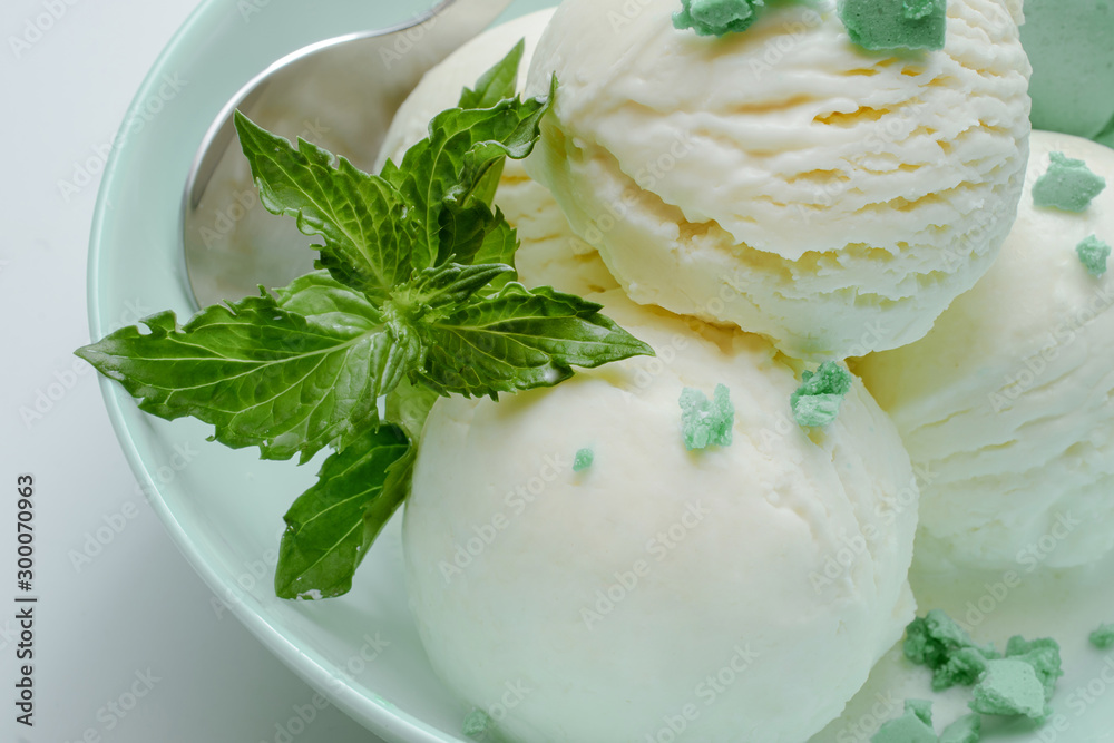 Balls of fresh ice cream with a sprig of mint and mint macaroon.
