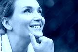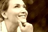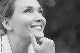Close-up portrait of a smiling woman on the street. Happy woman's face closeup, outdoors. Happy businesswoman in a light jacket looks at the camera. Urban portrait of a beautiful blonde woman.