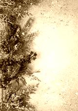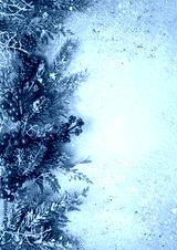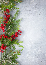 Christmas or winter background with a border of green and frosted evergreen branches and red berries on a grey vintage board. Flat lay