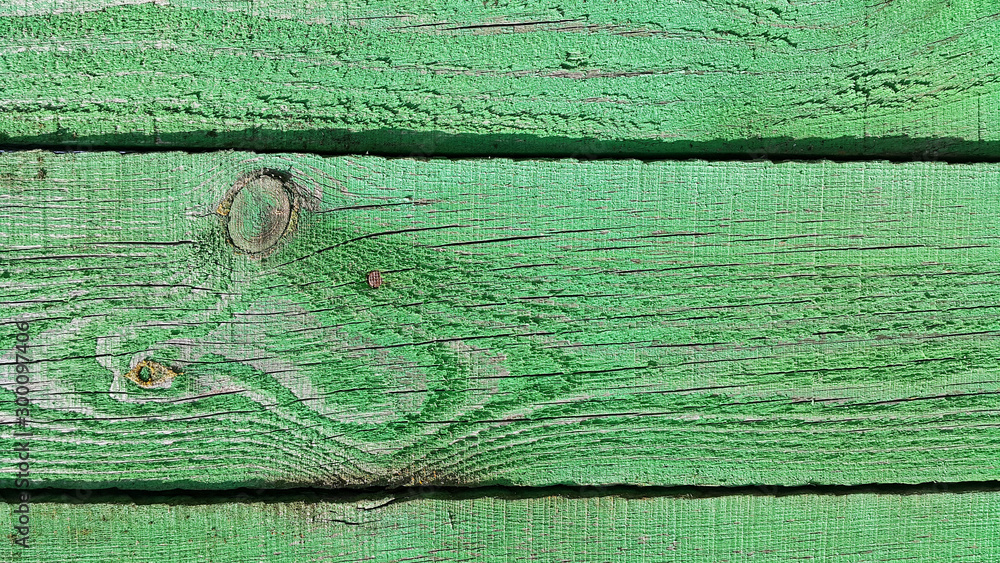 Texture of weathered wooden green painted fence