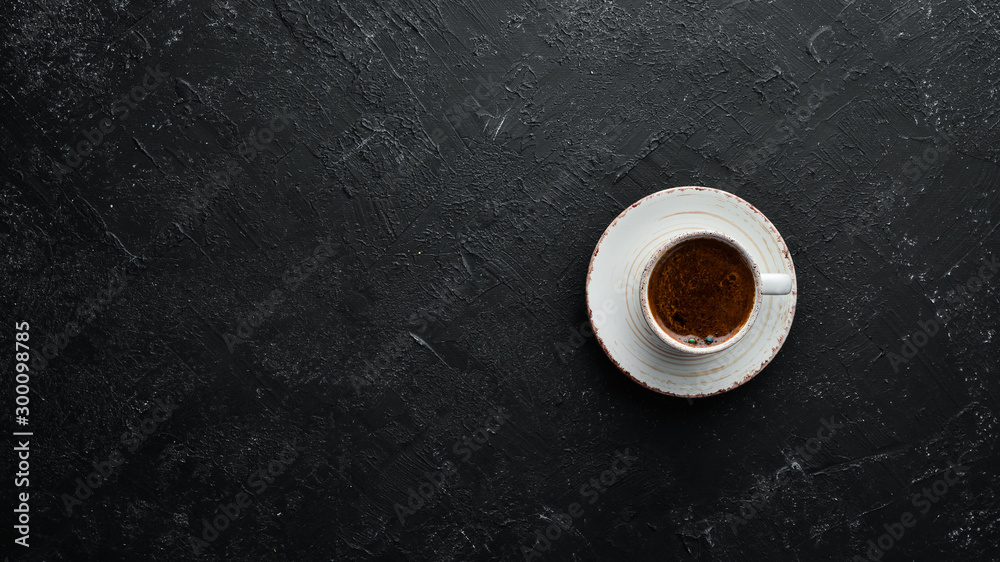 Cup of fragrant black coffee. On a black stone background. Top view. Free space for your text.