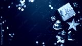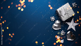 Merry Christmas and Happy Holidays greeting card, frame, banner. New Year. Noel. Christmas ornaments and gift on blue background top view. Winter xmas holiday theme. Flat lay