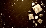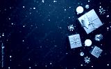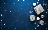 Merry Christmas and Happy Holidays greeting card, frame, banner. New Year. Noel. Christmas ornaments and gift on blue background top view. Winter xmas holiday theme. Flat lay