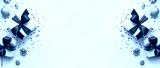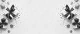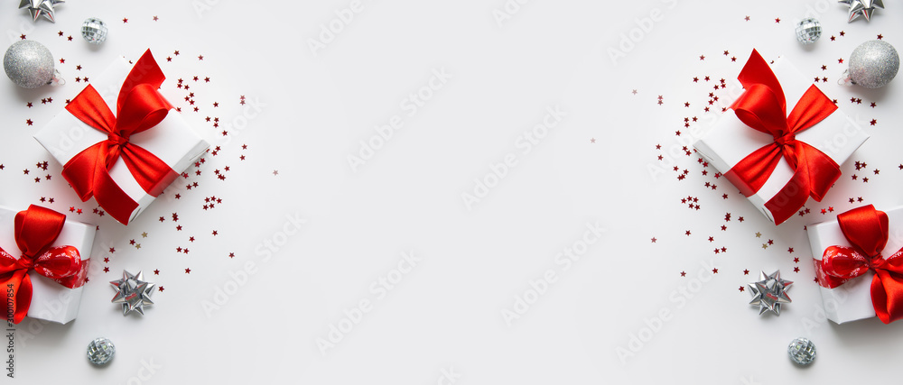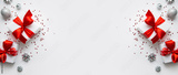 Christmas and New Year holiday background. Xmas greeting card. Christmas red ribbon gifts and ornaments on white background top view. Flat lay