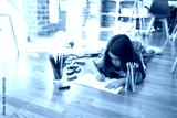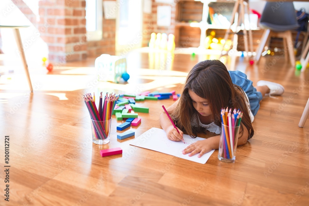 Adorable toddler lying down on the floor drawing using paper and pencils at kindergarten