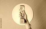 Female hand wrapped in cable holds phone tube against coral color background with blue circle. Port art. Creative minimalism. Top view