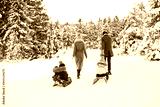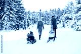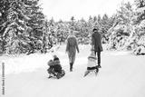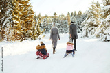 Happy family sledding in the park in winter.