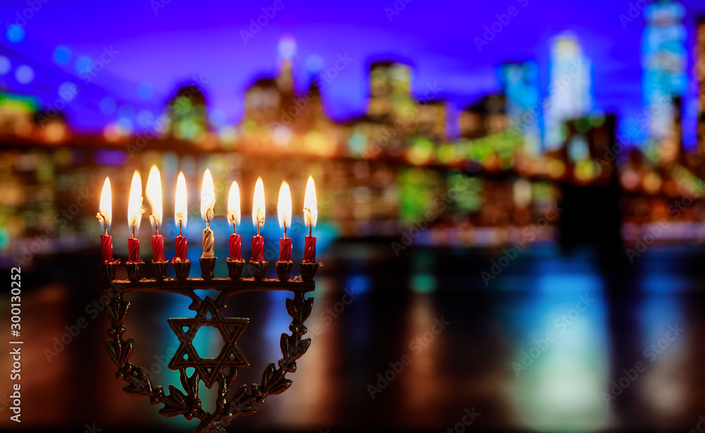 Hanukkah menorah symbol of Jewish traditional holiday Brooklyn Bridge over night New York City with lights