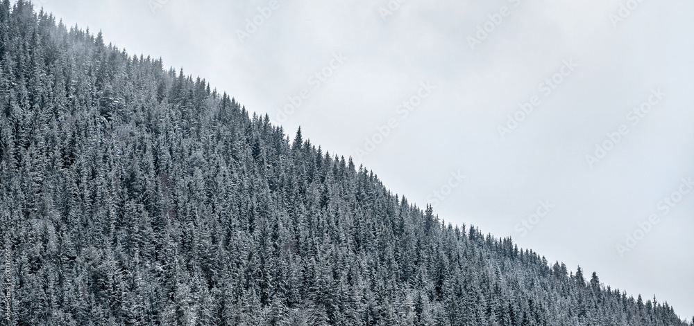 Winter mountains with white snowy spruces. Wonderful wintry landscape. Amazing view on snowcovered forested mountain slope. Ski resort. Tourism concept. Happy New Year
