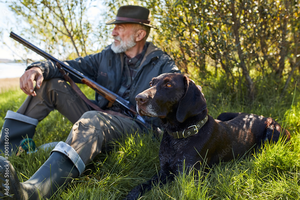 Looking for trophy with dog. Senior man ready to hunt. Sit having rest before hunting