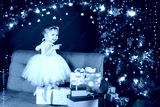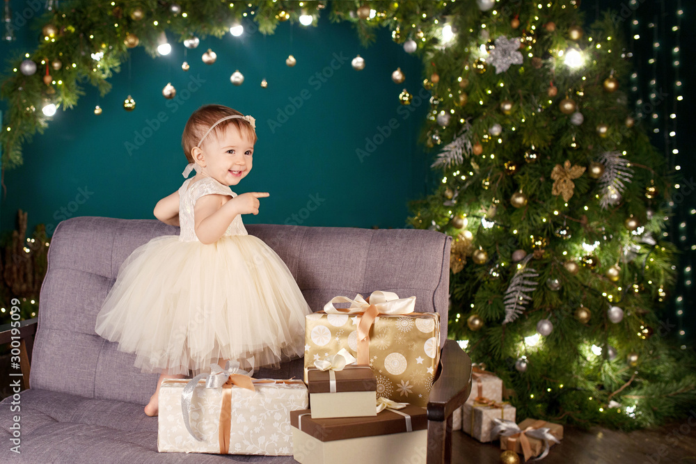 Christmas and New Year celebration concept. Pretty little girl in white dress playing and being happy about christmas tree and lights. Winter holidays. Copy space
